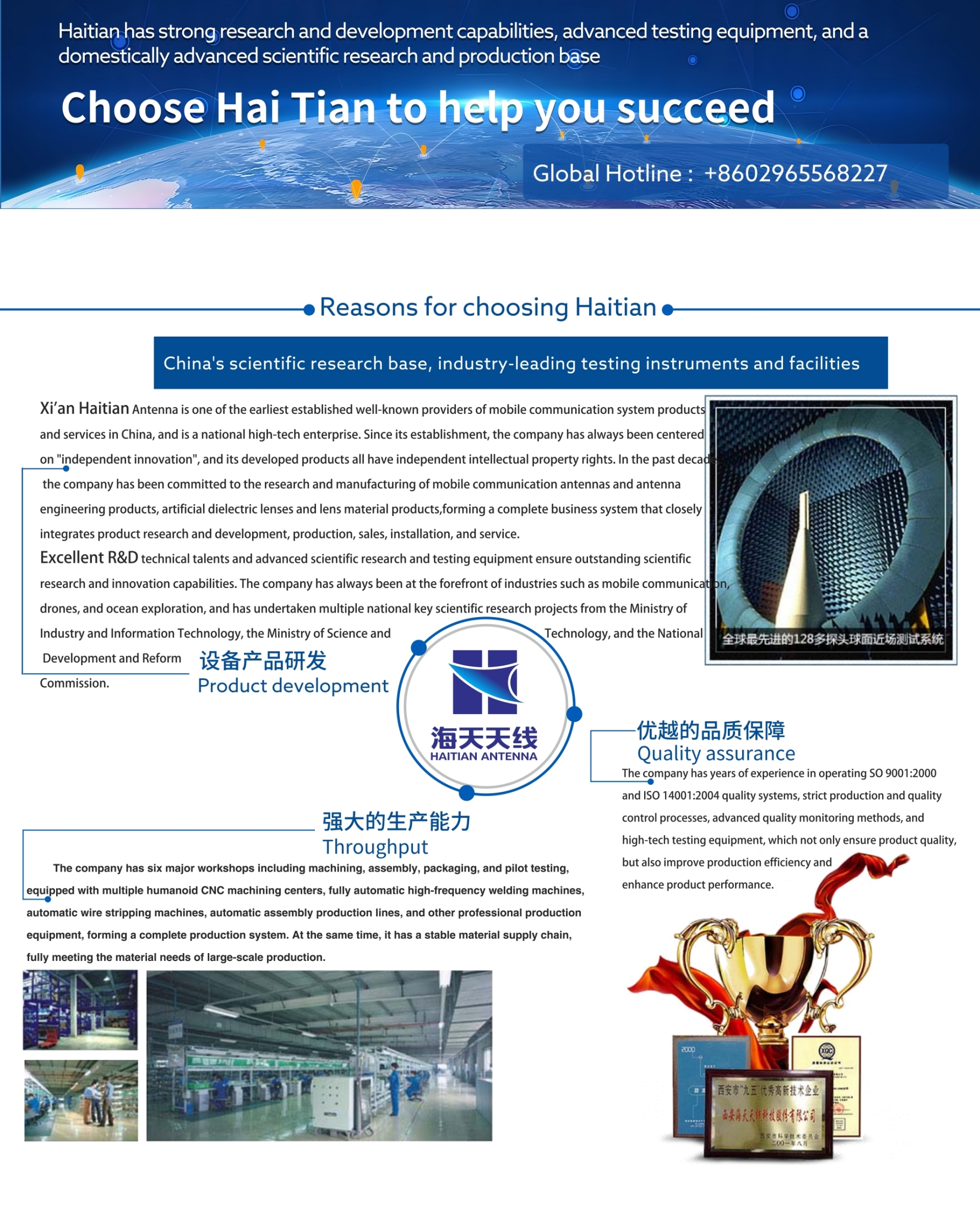 Xi'an Haitian Antenna Technology Co., Ltd. is a large modern technology holding enterprise. Since its establishment in 1992, Xi'an Haitian has always adhered to the business philosophy of "people-oriented technology innovation, serving society and pursuing excellence", guided by market demand, and continuously committed to the industrialization of achievements Our company has received multiple visits and care from leaders at the central, provincial, and municipal levels, fully reflecti